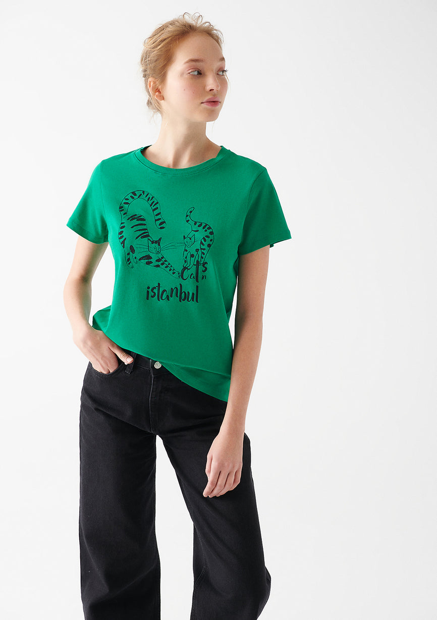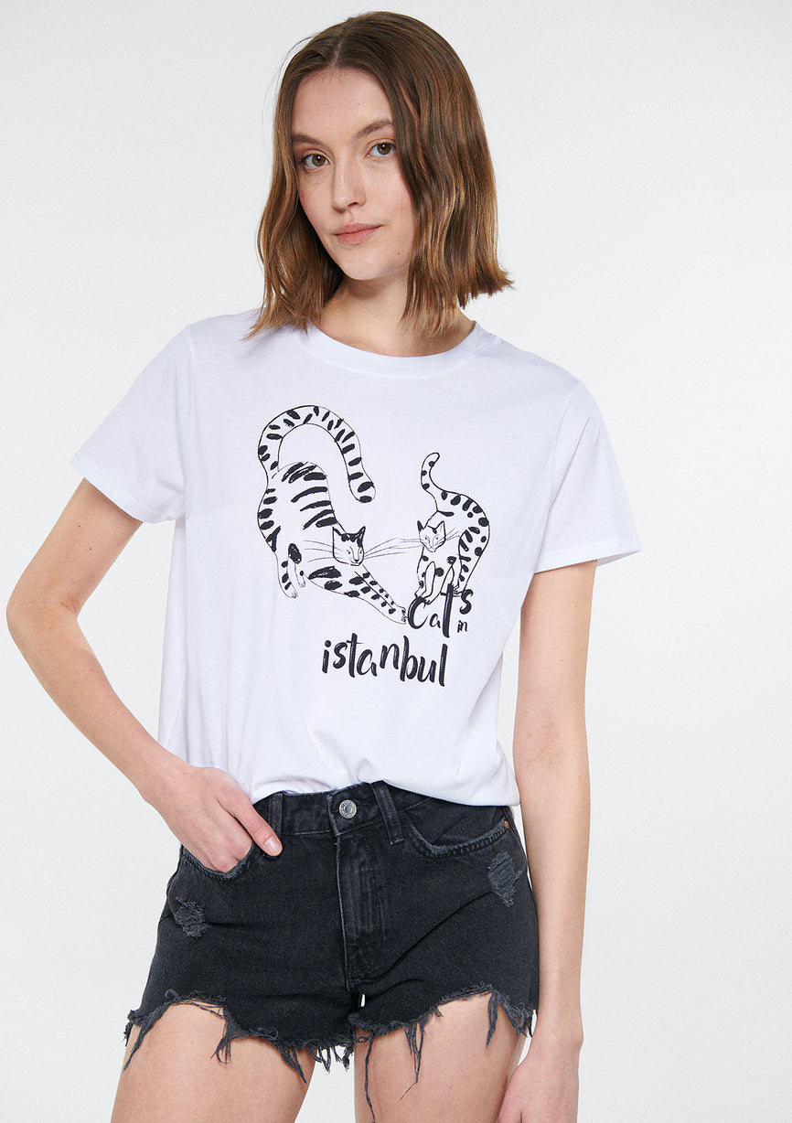 Cat Printed White T-Shirt