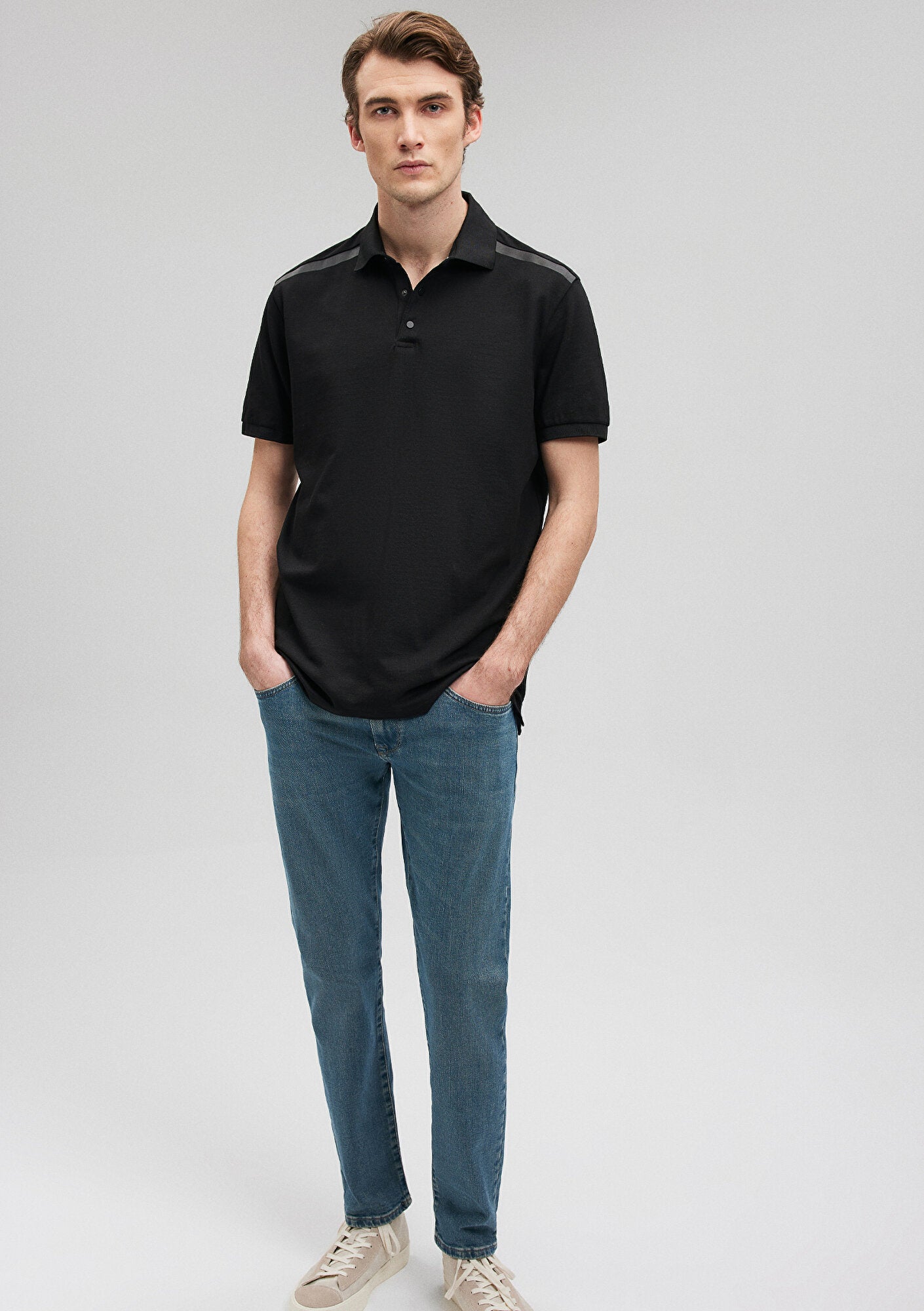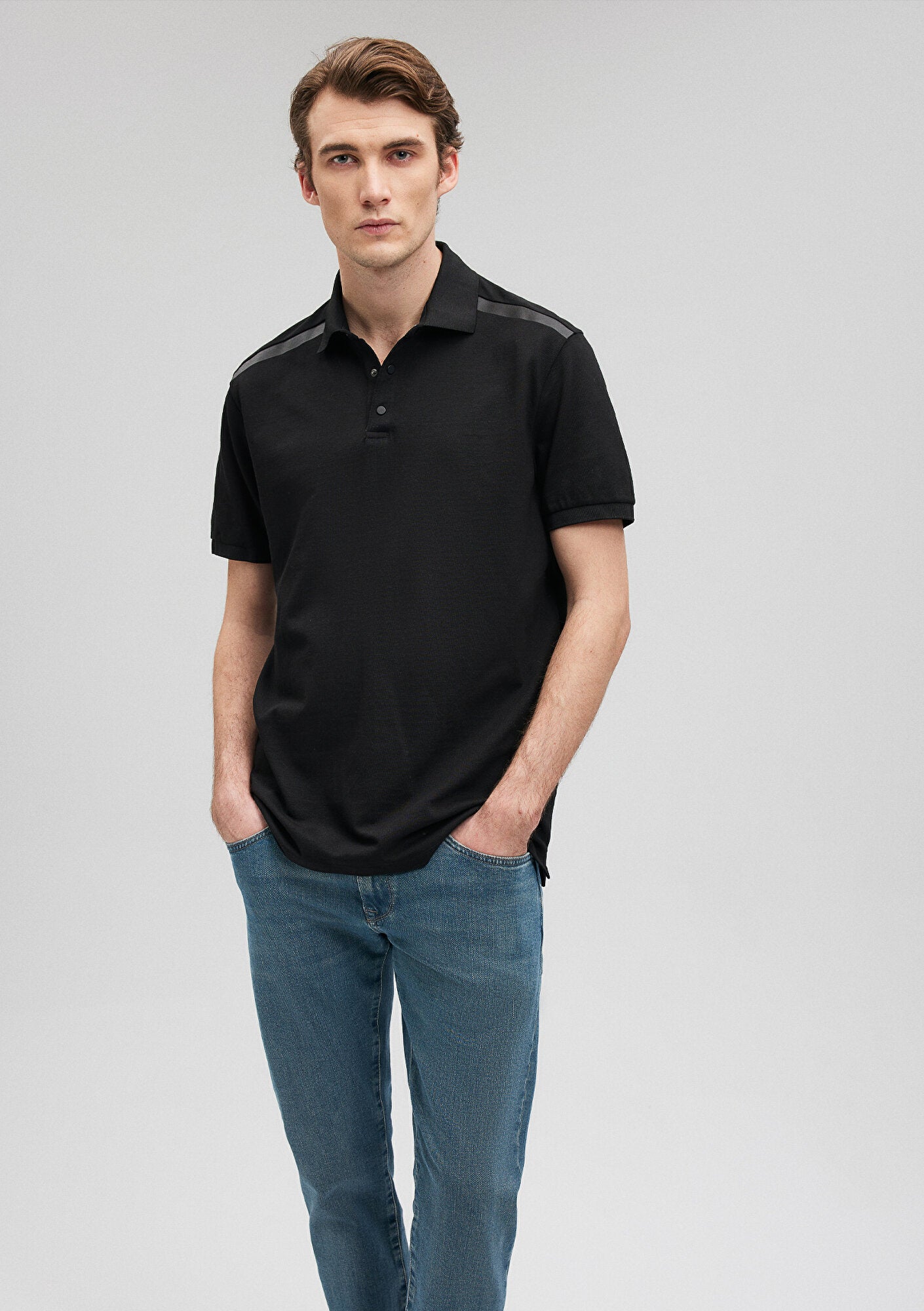 Black Polo T-Shirt from Mavi Black collection. Mavi s signature series Black offers a premium look with logo applications enriched by different techniques. The new Mavi Black collection, which comes to life in oversized cuts and elegant, timeless pieces made from Tencel-blend fabrics, redefines the style codes of the modern man.